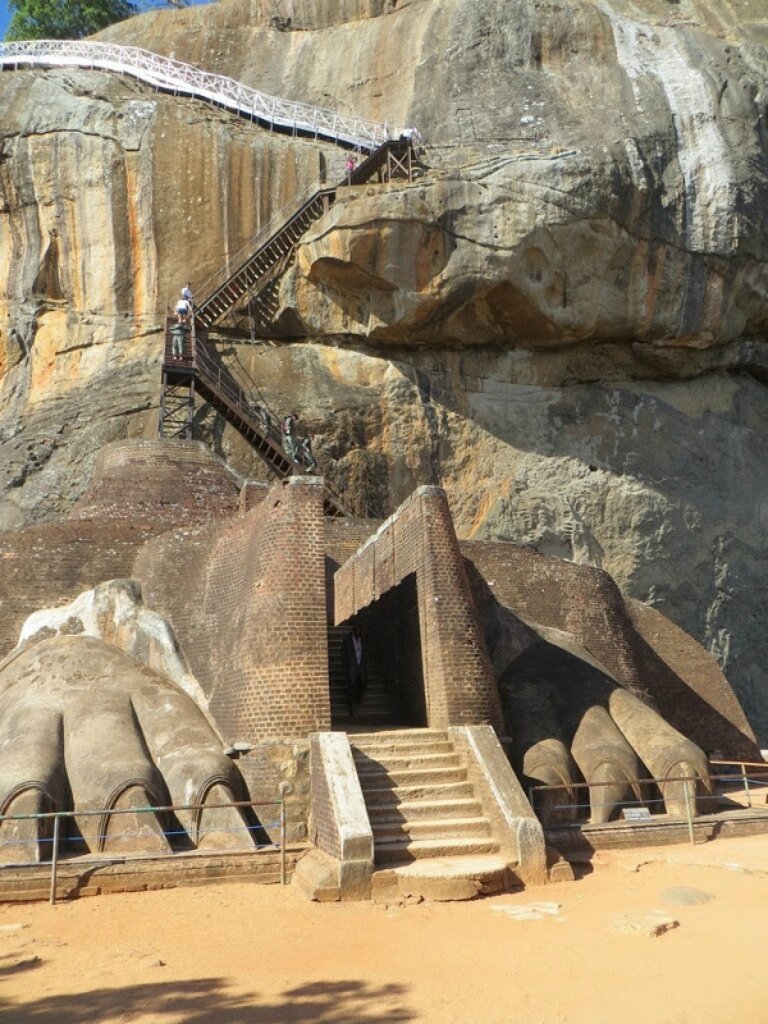 Замковый комплекс Сигирия, Шри–Ланка был вырублен в 370–метровой скале до 5 века н.э. По легенде, его построил король–узурпатор Касапа, чтобы спастись от многочисленных врагов. В пятом веке нашей эры Касапа, старший сын короля Датусены, должен был унаследовать престол, но отец решил в пользу младшего сына Могаллана. Касапа воспылал ненавистью к отцу и заключил его в темницу, а в 477 г. участвовал в его умерщвлении. Могаллана ужаснулся от страшных деяний старшего брата и скрылся в Южной Индии. Опасаясь мести Касапа решил построить столицу в труднодоступном месте. И он выбрал скалу Сигирия, 370 м в высоту. Король и его архитекторы расчистили место вокруг скалы и построили великолепный город, окруженный садами с фонтами и бассейнами. Соорудили самые изумительные лестницы в мире: ступеньки вырезаны между лапами, горлом и челюстями неимоверных размеров льва. Лев — эмблема государства и форма устрашения. Часть скалы, выше головы льва, была расписана образами Касапы и его отца Датусены. На ве