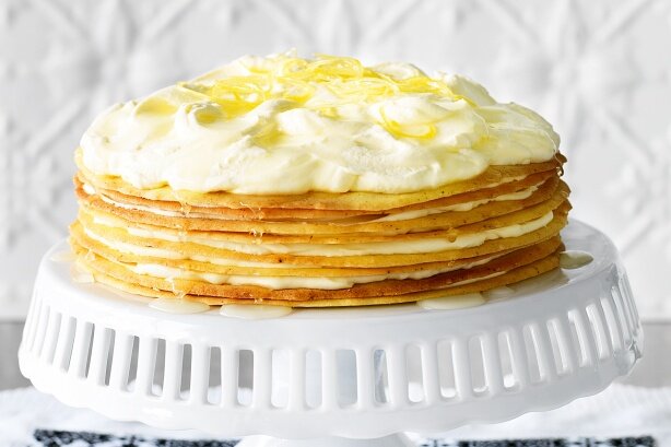 5. Поместите первый слой пирога на красивое блюдо, покройте его лимонной начинкой. Положите сверху следующий слой пирога, и снова покройте творожной начинкой. Аналогичную процедуру повторите с оставшимися коржами. Сверху лимонный пирог обильно смажьте творожной сливочной начинкой. Накройте пирог крышкой, и отправьте настаиваться в холодильник на несколько часов (лучше готовить на ночь).