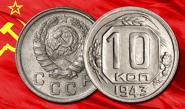 Год 1943 – середина тяжелой войны. Однако выпуск разменной монеты в СССР все же продолжается, но уже не в Ленинграде, а временно в Краснокамске. И сели в 42-ом объемы тиражей были мизерными, то в 43-ем они уже начинают постепенно возвращаться к довоенным цифрам. При этом чтобы хоть немного сэкономить на чеканке, часть штемпелей реверса для 10 копеек в 1943 г. решили вырезать из старых неиспользованных в предыдущем году штемпелей. Обычно для нового выпуска штемпельные пары полностью либо частично обновляют, улучшая лицевую сторону и изменяя дату на оборотной. Но в войну подобное расточительство недопустимо. Граверы просто взяли старые еще годные маточники и подправили у них цифру «2» в датировке на «3». В итоге получились вполне рабочие штампы для советских гривенников тиража 1943 года. Но отчеканен ими оказался не весь выпуск, а только его малая часть. Вообще же существует шесть разновидностей десятикопеечной монеты 1943 г. В этом году использовалось три варианта штемпеля для аверс