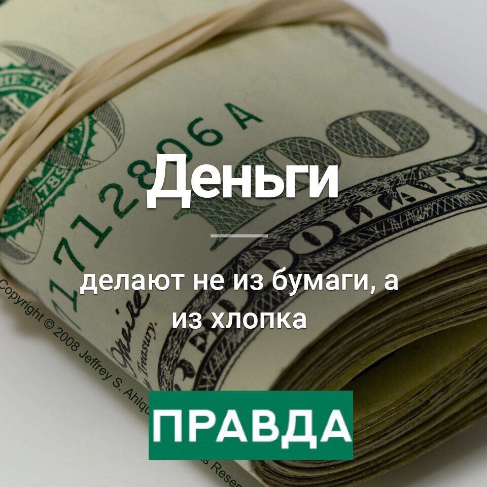 «Бумажные деньги» делают из хлопка и льна (которые иногда еще называют «тряпичной бумагой») . Полотно далее вымачивают («проклеивают» ) в желатине — для придания ему большей прочности. Изготавливаются денежные бумаги в большинстве стран в основном из хлопковых и пеньковых волокон с небольшой добавкой древесной целлюлозы. Бумага имеет проклейку в массе, а в некоторых случаях также и поверхностную. В составе этой бумаги большой процент волокна, обычно идущего для производства тканей, и еще какие-то неведомые добавки, придающие бумаге незначительные черты полимерного пластика. Так что бумага для банкнот частично имеет свойства бумаги, кое-чем напоминает ткань, и чуть-чуть похожа на пластиковую плёнку. Получается, что это как бы не совсем бумага, но и не ткань, а нечто среднее.