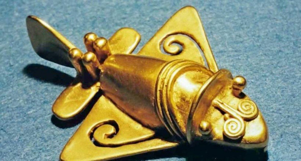 В Музее золота Колумбии хранятся необычные предметы. Сделанные из чистого золота фигурки размером около 4 сантиметров напоминают птиц, летучих рыб и самолеты одновременно. Именно сходство с летательными аппаратами привлекает к необычным фигуркам внимание исследователей со всего мира, а сама коллекция даже получила название «колумбийские самолетики богов». Эти фигурки были обнаружены при раскопках в Колумбии и, как полагают исследователи, принадлежали индейским вождям. Они были идентифицированы как амулеты или ритуальные украшения и долгое время выставлялись в этом качестве в музее. Помимо Музея золота в Колумбии, подобные фигурки хранятся в Музее Метрополитен в Нью-Йорке. Но в середине XX века на золотые изделия обратили внимание авиаконструкторы. Особенно заинтересовало исследователей расположение хвостовой части золотых фигурок. Сделанный в форме треугольника хвост расположен перпендикулярно к основной конструкции. Это типичное строение хвостовой части самолета, а в живой природе