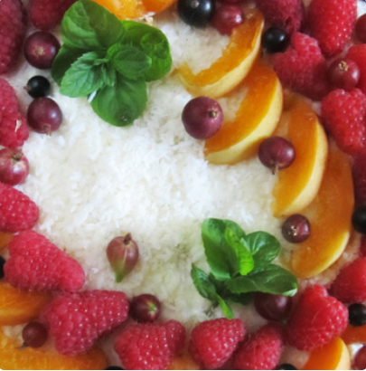 Замазываем все неровности получившегося торта смесью крошки со сливками. Поверх торта наносим чистые взбитые сливки тонким слоем. Посыпаем поверхность сливок кокосовой стружкой. Украшаем фруктами и листиками мяты. Приятного аппетита!