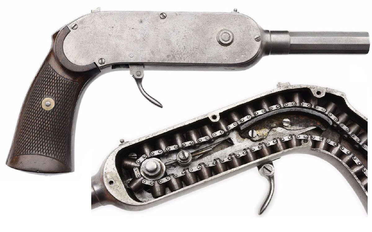 Порою думаешь: «Все, это определенно самое странное оружие, что я видел», - и каждый раз ошибаешься. Так было с цепным ружьем Триби, но его легко побил пистолет Гайкота. У Guycot Chain Pistol цепь из 40 звеньев с патронами располагается внутри корпуса, изгибаясь и уходя в рукоять. За исключением пары патентов документальных свидетельств об этом оружии практически не сохранилось. Патенты принадлежат Полену Гэю (Paulin Gay) и его партнеру торговцу Анри Гено (Henri Guenot). Их экзотическая конструкция образована цельной металлической рамой, закрытой металлическими щечками-крышками, крепящимися с помощью винтов. На левой стороне пистолета установлена кнопка предохранителя. Заряжание производится через окно в верхней части пистолета. Патроны располагаются в 40 камерах, собранных в цепь. Очевидно, заряжать их обычными пулями было бы невозможно. Гэй и Гено использовали безгильзовые патроны в хвостовой части которых проделаны полости, заполненные зарядом из пороха и бертолетовой соли.