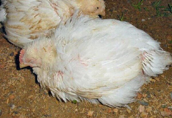 Больная птица становится подавленной, вялой, сонливой и малоподвижной. При поражении воздухоносных мешков выдох сопровождается характерными хрипами и свистом, отмечаются симптомы затрудненного дыхания.