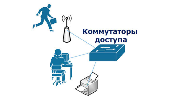 Начинается сеть передачи данных с коммутатора уровня доступа. Непосредственно к данному коммутатору подключаются рабочие места: компьютеры, ноутбуки, принтеры, многофункциональные и различного рода другие устройства, например, беспроводные точки доступа. Соответственно оборудования у вас может быть много, подключаться к сети оно может в совершенно разных местах (этажах или даже отдельных зданиях).