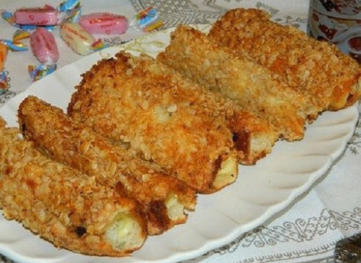 Предлагаем подойти к приготовлению завтрака с фантазией и творчеством. Приготовив горячие бутерброды в виде трубочек, ваша семья попросит их на следующий завтрак. Ингредиенты 8 кусочков хлеба для тостов 8 кусочков квадратного плавленого сыра 30 гр. майонеза 2 яйца 150 гр. овсяных хлопьев без варки Соль и черный молотый перец по вкусу Растительное масло Приготовление Взбиваем венчиком яйца, добавив соль и черный перец. Ломтики хлеба раскатываем скалкой, смазываем чайной ложкой майонеза, выкладываем на каждый кусочек плавленый сыр и сворачиваем в трубочку. Окунаем во взбитые яйца, а затем в овсяные хлопья. Обжариваем на растительном масле до золотистой корочки. Приятного аппетита!