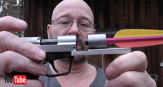 Немецкий youtube-блоггер JoergSprave занимается разработкой и изготовлением различных занятных оружейных систем. В новом видео ведущий решил ответить пользователям на запросы о возможности использования холостых патронов для запуска арбалетных стрел в связи с большими временными затратами на накачку пневматических винтовок и пистолетов. Используя охолощенный сигнальный пистолет Steel Eagle в 9мм калибре, известный в разных странах под многими названиями (прим. Micro Desert Eagle, WASP, ZVI и т.д.) как основу, мастер изготовил платформу с трубчатой ведущей и вертикальной рукояткой для совместного использования с оружием, удержания снаряда и использования энергетики пороховых газов. Система изначально была проверена на компрессоре. Создание такой насадки вынужденное — в Германии запрещено модифицировать ствол, нарезая резьбу для более проверенных дульных устройств и дальнейших модификаций их под стрелы. Идея сработала, но с небольшой мощностью. Ведущий заранее предупреждал, что порохово