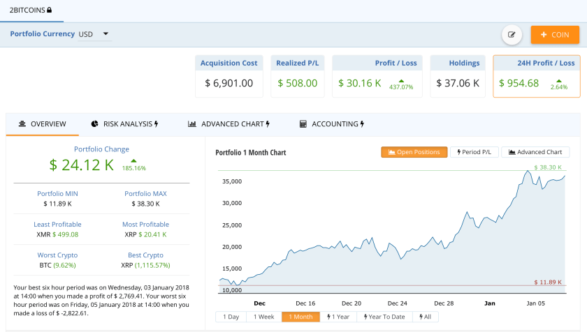 Мы уже рассказывали о приложении для отслеживания курсов криптовалют под названием Blockfolio, в котором была опция ведения вашего персонального портфеля криптоинвестора. Вы добавляли в приложение ваши активы и отслеживали их стоимость. Но приложение довольно ограничено в своих возможностях. Да и зачастую хочется взглянуть на свои криптосбережения на экране обычного компьютера или послать ссылку на своё портфолио друзьям и знакомым — пусть слюну пустят… Как вам такой внешний вид для вашего портфолио? Жмём кнопку Portfolio и регистрируемся. Создаём портфолио и придумываем для него название. Портфолио может быть публичным — тогда вы сможете давать ссылку на него своим друзьям, а они будут видеть все ваши сбережения. Выбираем нужную нам валюту и жмём Create. Нажимаем кнопку Add Coin и добавляем монеты, которые вы уже купили. Например, мы добавили Monero 5 монет, купленных по $122 17 ноября 2017 года. Очень радует, что можно добавить 95% существующих в мире монет. Мы пока не сталкивалис