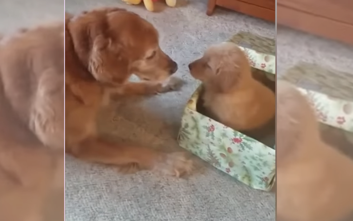 Этот 12-летний золотистый ретривер Кеш видимо очень хорошо вел себя в этом году, так что Санта Клаус решил порадовать его на Рождество. Три года назад у Кеша ушел друг, и он был в одиночестве. Поэтому на это Рождество хозяйка преподнесла ему в подарочной коробке его нового братика, с которым теперь он будет веселиться. Вы только посмотрите, как он обрадовался! Посмотрите на эту милую встречу в этом забавном видео!