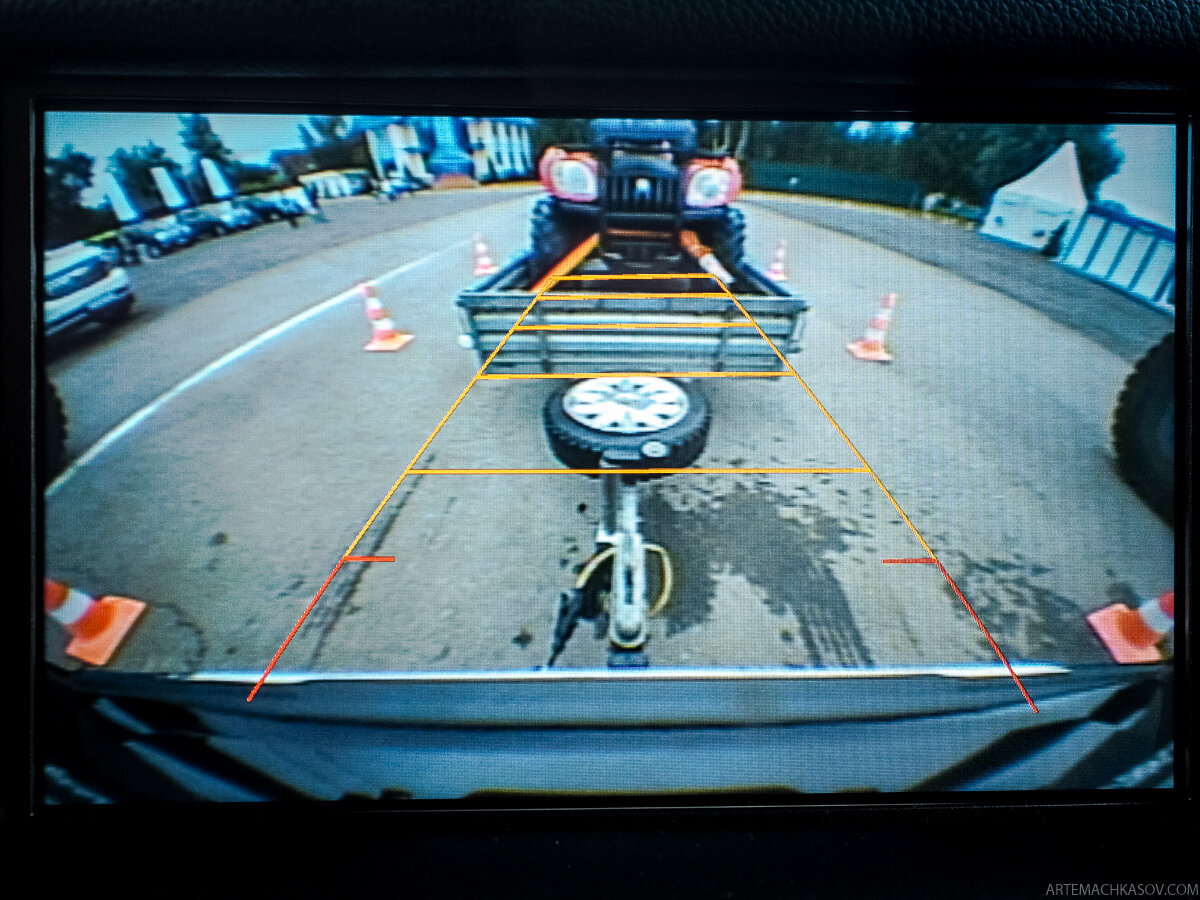 «Когда при движении задним ходом прицеп появляется в правом зеркале, крутить руль нужно не налево, а направо. Иначе прицеп развернет боком.» Объяснения инструктора Дениса звучат просто, но мозг поначалу отказывается заставлять руки крутить руль влево при развороте направо. Через десять минут, впрочем, это получается уже гораздо легче. Главное не торопиться – при начале разворота сначала выставить угол поворота прицепа, поворачивая руль в противоположную сторону, а потом уже все как обычно. Смотрю на картинку с камеры заднего вида, и не могу нарадоваться – прицеп аккуратно поместился меж конусов.