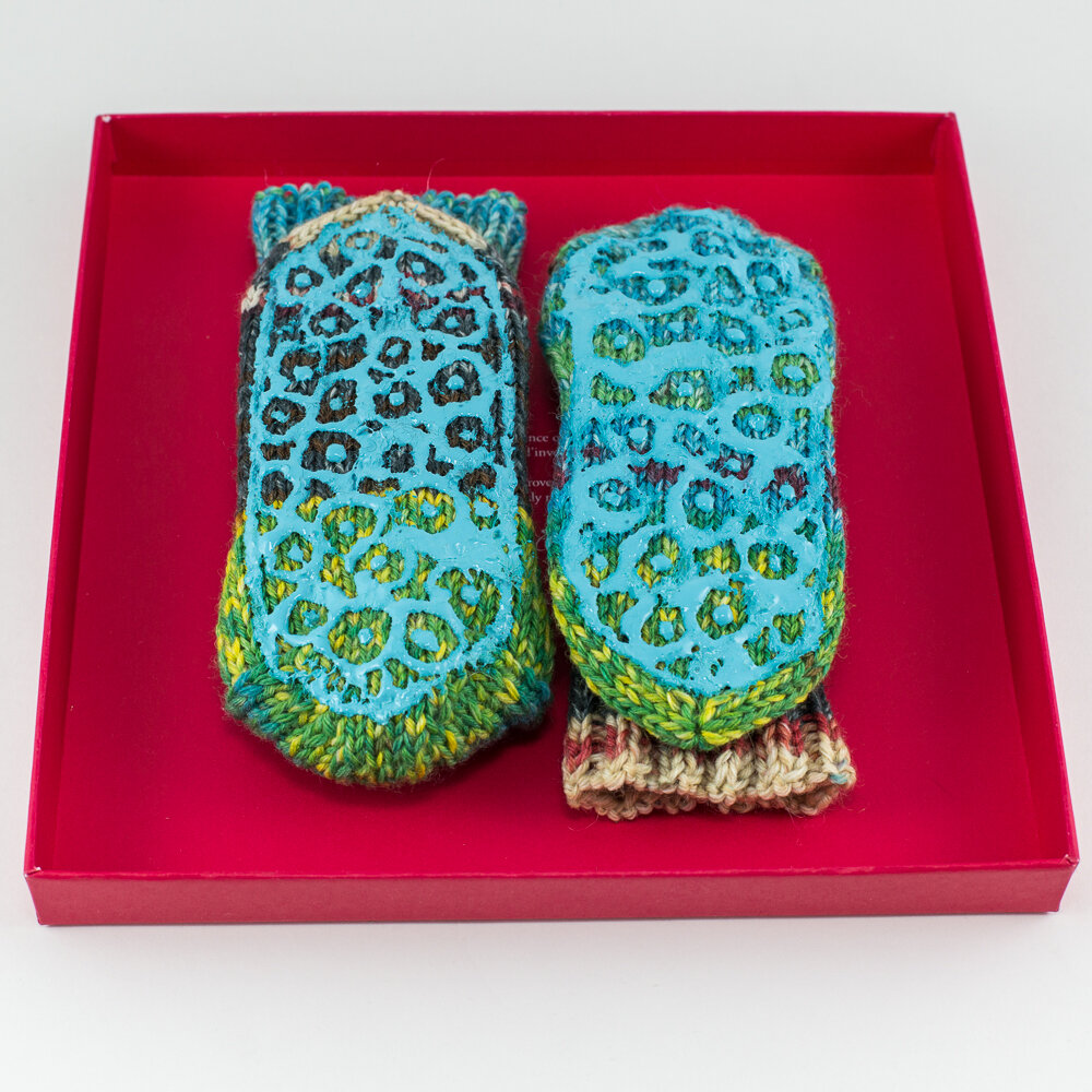 Что такое антискользящий гель (или латексное молочко, или силиконовый гель, или резиновая краска против скольжения)? По сути, это специальная краска 3D. Используйте её, если любите ходить дома в носках без тапочек. Она особенно нужна для детских носочков, чтобы маленькие ножки не скользили по паркету и ламинату. Но по опыту могу сказать, что и взрослым Sock-Stop пригодится. Давайте рассмотрим, как пользоваться антискользящим гелем "Sock-Stop" от немецкого концерна EFCO (или любыми его аналогами). Для примера возьмем образец, связанный из шерстяной пряжи. Если вы собираетесь нанести гель-краску на подошву носка, то стоит положить внутрь него лист бумаги или картона, который надежно защитит вторую сторону изделия от протеканий. Важно: обязательно (!) нужно потренироваться на чем-нибудь, прежде чем наносить краску на носки. Она очень стойкая, ни в жидком состоянии, ни после высыхания убрать слой краски с ворсистой поверхности практически невозможно. Снимаем защитный колпачок с краски.