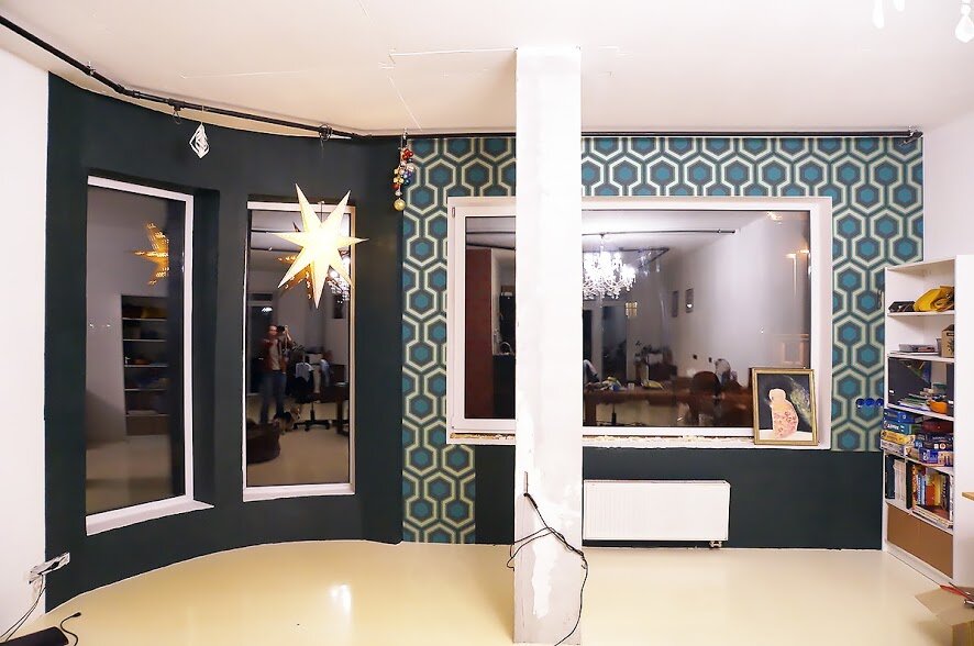 Думали и о зеркальной мозаике, и о том, чтобы заказать по зеркалу на каждую сторону столба так, чтобы он стал зеркальным целиком. И о более дешевом варианте - купить несколько готовых зеркал и наклеить их. Проблема возникла внезапно: столб оказался страшно кривым.