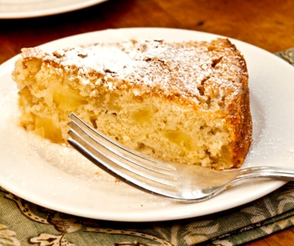 Используя мелкое сито, посыпьте шарлотку сахарной пудрой. Пирог можно подавать теплым или комнатной температуры, можно добавить немного взбитых подслащенных сливок или ванильного мороженого.