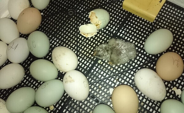 На фото инкубация яиц разных пород кур, появился цыпленок Араукана из голубого яйца.