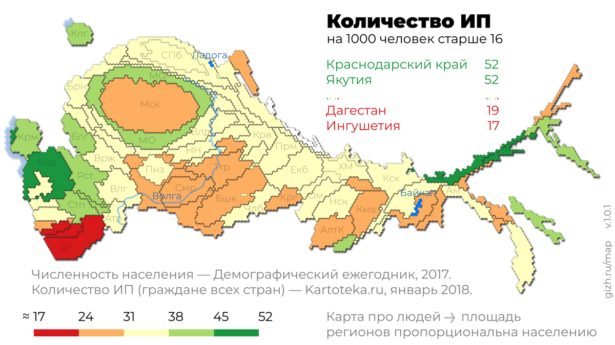 Мы используем карту России, где площадь регионов пропорциональна населению. Она позволяет увидеть, как живёт большинство людей в нашей стране, и где живут хорошо, а где похуже. Сначала она может показаться немного непривычной, но обратите внимание: подписаны регионы, есть географические ориентиры, есть интерактивная версия, где подписаны все регионы. Посмотрим на количество зарегистрированных в России предпринимателей. На душу населения. И, пожалуй, на трудоспособное население, то есть старше 16 лет. Видимо отчетливый кластер на Юге России — туризм, агрпромышленность. На Востоке выделяются ярко-зеленые Якутия с Магаданской областью, и салатовая республика Алтай. Видимо, в таких краях люди в частном порядке занимаются самообеспечением — например, торговлей. Столицы при этом вообще не выделяется. Может быть, дело в специфике выбора правовой организации компании? Посмотрим на все юрлица — ИП и другие действующие коммерческие организации (в основном, ООО). Действительно, так центры пре
