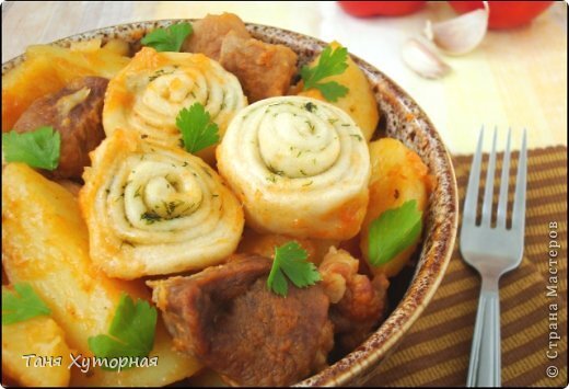 Уверенна на 100% этот рецепт понравится всей вашей семье! Мясо можно использовать любое, какое вам нравится больше, тесто можно использовать дрожжевое или на кефире. ИНГРИДИЕНТЫ: -Говядина -300 грамм; -Картофель-3 штуки; -Лук-1 штука; -Морковь-1 штука; -Болгарский перец-1/2 шт. (по желанию); -Томатная паста-1 ст.л.; -Специи любимые -Соль по вкусу Для теста: Мука-1 стакан Яйцо-1 штука Вода- 2 ст.л. Соль 1/2 ч.л. ПРИГОТОВЛЕНИЕ -Замесить тесто -Картофель и мясо нарезать крупными кубиками.Лук,морковь и болгарский перец чуть меньше -Мясо тушить 20-30 минут,добавив 1/2 стакана воды.Как вода полностью испарится, добавить масло, обжарить. -К говядине добавляем овощи и обжариваем минут.Добавить томатную пасту, соль, перец.Сверху кладем картофель.Все это залить водой, закрываем крышку. -Тесто раскатать тонко(чем тоньше, тем лучше),смазать сливочным маслом.Свернуть в рулетик и разрезать на кусочки 1,5-2 см.шириной. -Как картофель будет готов,укладываем сверху нудли. -Накрываем крышкой и тушим н