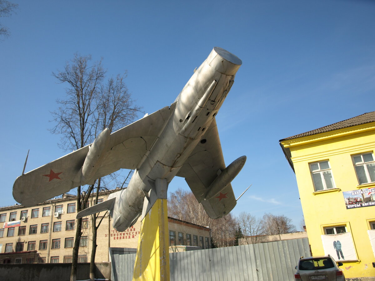 Реактивный истребитель МиГ-17 установлен рядом с бывшим дворцом пионеров на улице Советская в городе Щёкино Тульской области. Проехать к памятнику можно на общественном транспорте до Щёкинского автовокзала, а затем пройдя пешком около одного километра по улице Советской в южном направлении. Самолёт хорошо виден с дороги. Доступ в рабочее время свободный, территория огорожена, возможно вечером и ночью проход ограничен, но мне это доподлинно неизвестно. Постамент высокий. Залезть и потрогать - сложно. Дата съёмки - 22 марта 2014 года. МиГ-17 (изделие СИ, самолёт И-330, по кодификации НАТО: Fresco, Фрескоу — англ. Фреска) — советский реактивный истребитель, разработанный ОКБ Микояна и Гуревича в конце 1940-х годов. Первым из серийных истребителей допускал достижение скорости звука, но для боевых полётов считался околозвуковым. Предназначался для замены МиГ-15. Состоял на вооружении многих стран мира и применялся в ряде вооружённых конфликтов, в том числе в боевых действиях во Вьетнаме