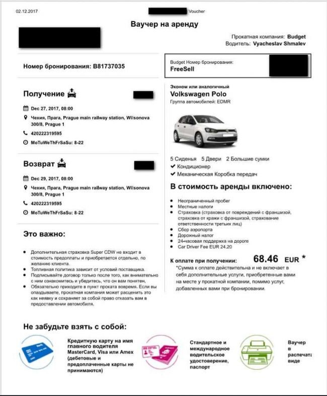 В восемь часов, зябким пражским утром у железнодорожного вокзала мы получали наш авто. Ваучер на скриншоте не представлен полностью (не вошло длинное пользовательское руководство мелким шрифтом), вспомним ключевые моменты: