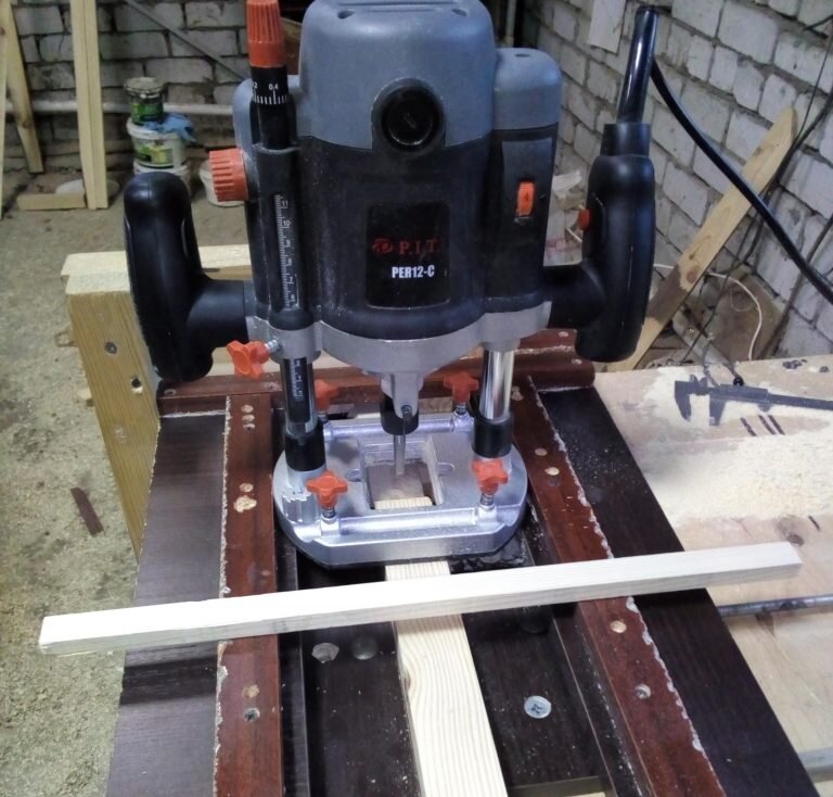 паралелльно фрезерованию. Движение фрезера (узнаете, это тот самый P.I.T. - один из "братьев") с боков ограниченивается планками, которые закреплены напостоянку и расположены строго параллельно. Движение вперед-назад ограничивается приклеенными планками, согласно длине паза. Заготовка в приспособе зажимается между двух