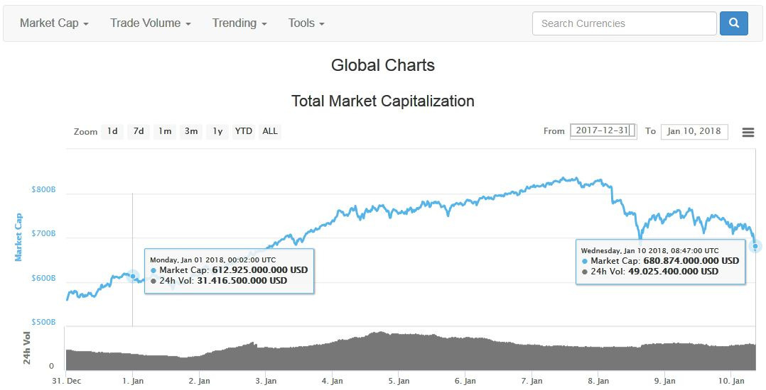 Криптосцена наполнилась стоном хомячков. В зависимости от того, в какую дискуссию я попадал я видел стоны по просадке каких-либо позиций. Боль разлилась по некогда весёлому сетевому сегменту. Но я не совсем разделяю эту боль. Да, мой портфель тоже просел, но я всё равно в плюсе. Мне хотелось взять на руки каждого кричащего от боли хомячка и объяснить две вещи: 1. 20 процентов дохода в год по вложенному капиталу - это нормально! 11 процентов за 10 дней - это мегакруто! 2. Ничто не вечно! Просадка не вечна, но и рост тоже не вечен - с этим нужно смириться. Ну а теперь, что же делать, что бы не быть хомячком. Для начала нужно пойти и оценить общий рынок. Сделать это можно, например с помощью графика оценки капитализации крипто-рынка. Поставте нужый вам период времени и посмотрите, что получилось - с 1-го января по сегодня капитализация возрасла на 11 процентов. (с 611 до 681 млрд. USD). То есть, если бы мы шли вместе с рынком, то мы были бы в плюсе! Как же делать, что бы идти с р