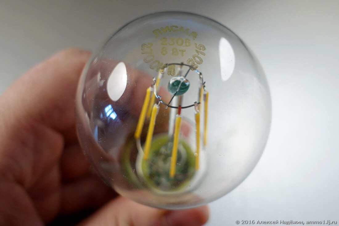 Колба светодиодной лампы герметичена, внутрь закачан гелий для улучшения отвода тепла от нитей. Сами нити закупаются в Китае, плата драйвера делается там же на заказ, но завод планирует наладить и собственное производство драйверов.