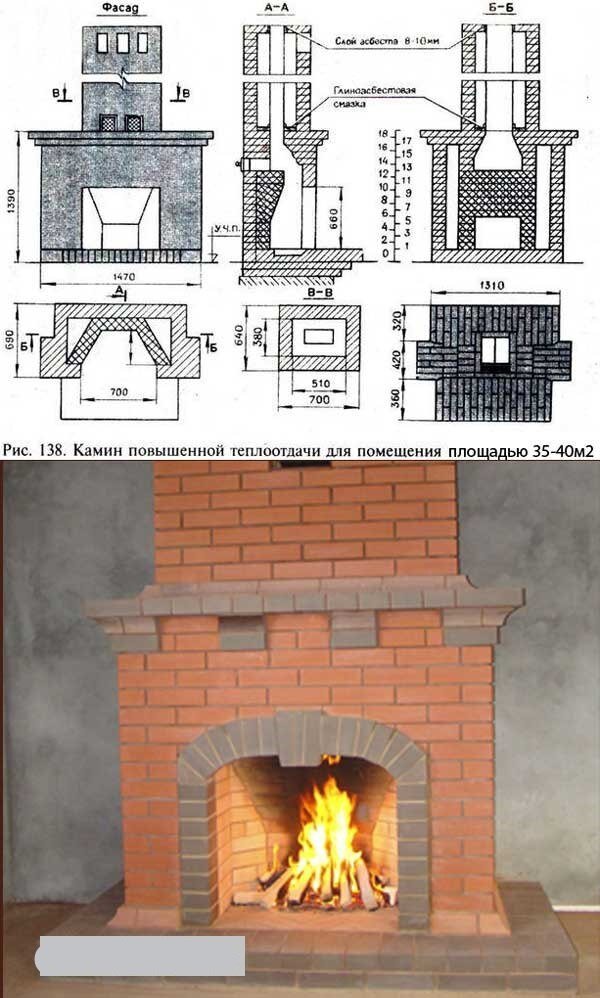 Для связки используют цементный раствор, содержащий просеянный мелкий асбест. Площадка выходит вперед портала на полметра, а по бокам от него на 0,3 метра. Швы имеют толщину 0,5-0,8 см. Очаг должен иметь глубину 0,41-0,51 м. Для увеличения процесса теплоотдачи боковые стенки устройства должны иметь наклон от 45 д 60° к задней поверхности. Последняя выкладывается вертикально на расстояние 0,36 м от пода, а далее с изломом, образующим наклонное зеркало. Нередко для усиления эффекта конвекции от горящего пламени, его отделывают отполированными листами стали. Этот излом на 15-20 см должен возвышаться над порталом, завершаясь вьюшкой. Ее сечение больше, чем таковое дымохода, в 1,3 раза. Затем следует дымосборник. В нем при чистке дымохода будет скапливаться сажа. Через специальную прочистку в боковой или задней стенки печи ее убирают. В дымосборнике, в верхней его части, необходимо поставить шибер или поворотную заслонку. Каковы требования к его устройству? Для качественной работы камина должно быть выдержано соотношение между сечением дымохода (поперечным) и проемом портала, которое равняется 1 к 8 или 1 к 9 для неоштукатуренных отопительных систем, и 1 к 12 или 1 к 10 для оштукатуренных. Между тем, размеры портала должны иметь отношение к общей площади нагреваемой комнаты как 1 к 50. Портал не должен иметь высоту более чем в два раза больше глубины очага.