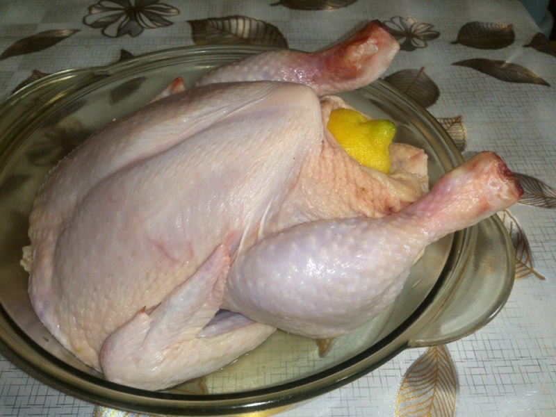 Компоненты: Тушка курицы – 1.8 кг.,соль – 2 ч. л., перец душистый горошек – 4 шт., лимон – 1 шт., лавровый лист – 1 шт.