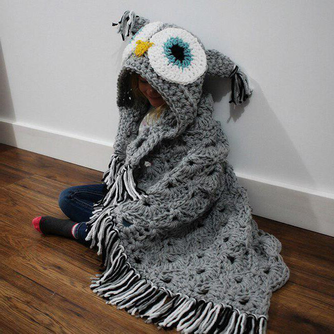 Плед с капюшоном-совушкой крючком из толстой пряжи своими руками + схема вязания