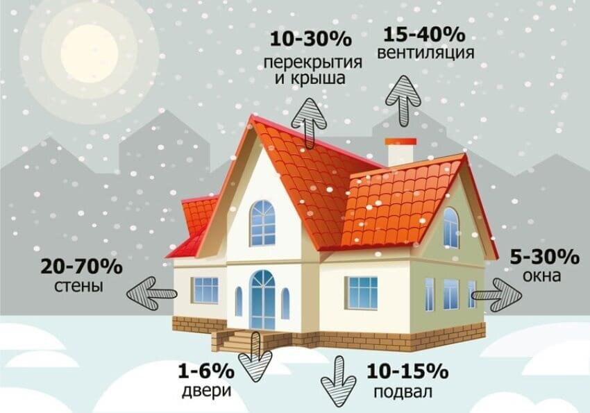 - Тепловых потерь через ограждающие конструкции — стены, окна, чердак, цоколь.