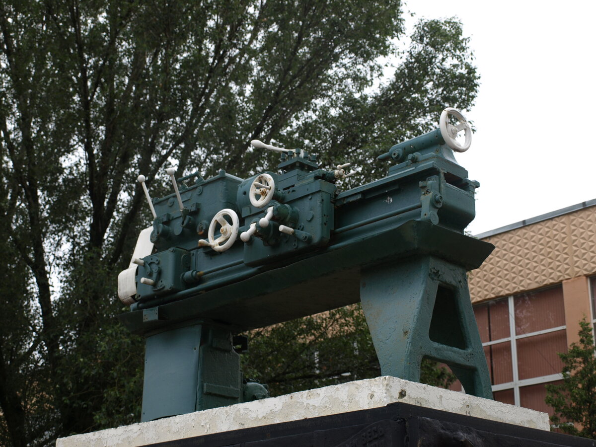 Не всегда у памятника техники есть крылья, колёса или руль. Например, у крыльца Брянского техникума энергомашиностроения и радиоэлектроники стоит старый токарно-винторезный станок. Проехать к нему можно на городском общественном транспорте (остановки "Королёва" или "Гоголя", Володарский район Брянска). Доступ свободный, можно подойти и потрогать. Охраны нет. Состояние памятника - хорошее. Дата съёмки - 16 июня 2015 года. Станок установлен на каменном постаменте с барельефами. На таких станках делались танки, пушки и снаряды к ним. Летом 1930 года Ижевскому заводу было предписано освоить производство токарно-винторезных станков. Первый цех по изготовлению станков был построен уже к концу осени и сразу же стал выпускать продукцию. Первой серией стали 900 станков Loewe, а через пол года пошли в серию станки типа American Tool. Созданное заводское станкостроительное КБ на основе этих моделей разработало токарно-винторезный станок "Удмурт". "Удмурт" выпускался большими партиями и разошёлс