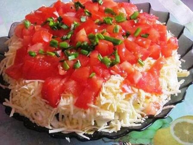 Рекомендую попробовать эту замечательную закуску-салат. Будь то праздничный обед или будничный ужин, она всегда будет уместна на вашем столе. Всего 3 составляющих в рецепте, а так необычно и свежо, вкусно и красиво) Что же за 3 секретных ингредиента, которые нам нужны: 2 свежих помидора 2 яйца 50 грамм твёрдого сыра 2 зуб. чеснока 100 грамм майонеза или сметаны соль чёрный перец зелень Пропорции продуктов можно увеличивать в зависимости от количества едоков, рассчитать совсем не сложно) Чеснок очищаем, измельчаем и смешиваем с майонезом или сметаной. По желанию можно и вовсе смешать майонез со сметаной, вообщем на любителя) Помидоры нарезаем тонкими дольками, яйца отвариваем и тоже нарезаем тонкими ломтиками. Сыр трём на крупной тёрке. На блюдо выложить слой помидоров, посолить, поперчить, смазать тонкой сеточкой майонеза. Следующим слоем идут яйца, их также чуть солим, перчим и покрываем майонезом. Далее посыпаем тёртым сыром и снова смазываем майонезом. Если у вас двойная или тройна
