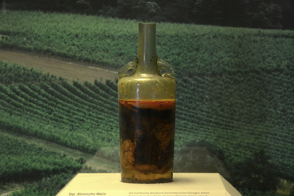 1. Несмотря на то, что производство стекла упоминается еще у Плиния Старшего, старейшая сохранившаяся до наших дней закупоренная стеклянная бутылка с вином датируется примерно 325-350 годом нашей эры. Она была обнаружена в 1867 году в регионе Рейнланд-Пфальц в захоронении богатого римлянина. Бутылка представляет собой полуторалитровый сосуд с двумя ручками в форме дельфинов, светло-желто-зеленого цвета, содержащий прозрачную жидкость в нижней трети и загустевшее вещество сверху. Это, предположительно, оливковое масло, залитое поверх вина для предотвращения его контакта с воздухом.