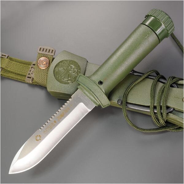 Последняя составляющая ножа, это ножны, которые изготовлены из полиамида зеленого цвета и являются частью этого комплекса для выживания. Внутри ножен имеется специальный отсек для вкладыша, на котором закреплено сигнальное зеркало и резиновые жгуты для разборной рогатки, которые можно также использовать для остановки кровотечения, а также нанесены основные знаки путешественника о помощи. Вместе с вкладышем в этом отсеке дополнительно находится скелетный нож со шнурком, который при случае можно использовать как острогу.