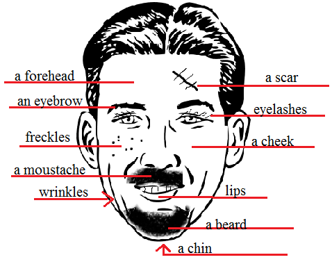 Сначала перечислим слова, которыми обозначаются основные черты лица. face [feɪs] - лицо She has a pretty face. - У нее красивое лицо. eye [aɪ] - глаз (множественное число - eyes) eyebrow ['aɪbrau] — бровь (множественное число - eyebrows) eyelash ['aɪlæʃ] — ресница (множественное число - eyelashes) eyelid ['aɪlɪd] — веко (множественное число - eyelids) nose [nəʊz] — нос mouth [mauθ] — рот lip [lɪp] — губа (множественное число - lips) cheek [ʧiːk] — щека chin [ʧɪn] — подбородок forehead ['fɔːhed] — лоб jaw [dʒɔ:] — челюсть Типы лиц oval face - овальное лицо round face - круглое лицо square face - квадратное лицо thin face - худое лицо chubby face - пухлое лицо Что еще есть на лице? scar [skɑː] - шрам (множественное число - scars) spot [spɔt] - прыщик, пятно на коже (множественное число - spots) freckle [ˈfɹɛkəl ] - веснушка (множественное число - freckles) wrinkle ['rɪŋkl] - морщина (множественное число - wrinkles) moustache [mə'stɑːʃ] -