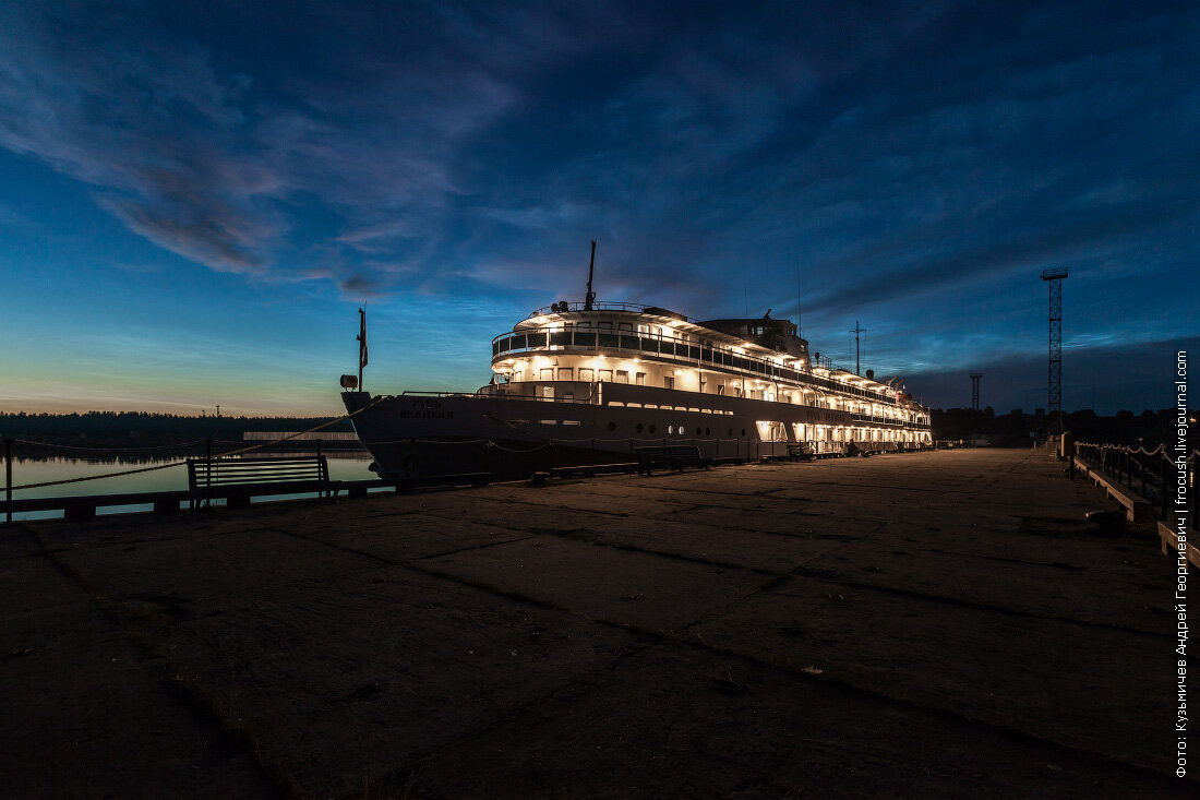 Для начала покажу ночную фотографию нашего теплохода «Русь Великая» у «Тамариного причала» Большого Соловецкого острова. Сделана она в 0:40 9 августа 2016 года. Эту фотографию можно скачать в разрешении 1920х1200 точек.