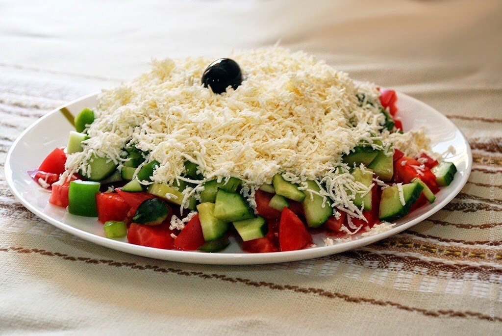Нам понадобиться: 1.Перец сладкий-2 шт. 2.Помидор крупный-2 шт. 3.Огурец-2 шт. 4.Луковица-1 шт. 5.Сыр или брынза-60-100 гр. Заправка: 2 ст.л. растительного масла 2 ст.л. уксуса соль по вкусу Способ приготовления: Сладкий перец, помидоры, огурцы и луковицу нарезаем небольшими кусочками,посолить и заправить растительным маслом и уксусом.Сверху салат украсить натертым на крупной терке сыром или брынзой.Посыпать зеленью петрушки.Приятного аппетита.