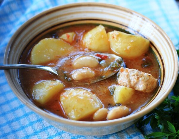 Чанахи, рецепт которого вы здесь видите, – вкусное блюдо, которое пришло к нам из Грузии. Классический рецепт чанахи – это мясо баранины, тушеное в глиняном горшке с овощами – картофелем, морковью, помидорами, баклажанами – щедро приправленное травами и специями. В советское время многие рестораны подавали чанахи, приготовленное порционно в небольших горшочках. На нашем современном столе это блюдо стало не только привычным, но и изменилась. Сегодня хозяйки готовят его каждая по-своему, совсем не сохраняя традиционного набора ингредиентов. В ход идет не только баранина, но и свинина и даже курица. А набор овощей и специй изменяется в зависимости от сезона. Я с радостью поделюсь семейным рецептом, которым пользуюсь сама, думаю, вам он тоже понравится . Продукты: 500 г свинины; 500 г картофеля; 1 морковь; 1 луковица; 1 стакан белой крупной фасоли; 1 стакан аджики; 3 ст. ложки томатного кетчупа; маленький пучок зелени (петрушка, укроп, зеленый лук); 3-4 зубчика чеснока; 1 ч. ложка молотой