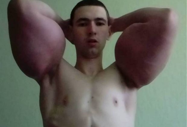 Кирилл Терехин - блогер, который специализируется на рассказах, как быстро и без лишних затрат накачаться. Свои бицепсы он накачал, не поднимаясь с дивана. Никаких гантелей и штанг. Только результат оказался совсем не таким, как ожидалось. 58 сантиметров. Такими объемами бицепсов в свои лучшие годы не мог похвастаться даже Шварценеггер. Но только эти внушительные показатели меркнут на контрасте с весьма щуплым телосложением обладателя шикарных мышц рук. Но блогер из Пятигорска не скрывает: это результат не тренировок, а ежедневных инъекций. В интернете у Кирилла прозвище "надувной качок". Вздутые вены, отеки, багровый цвет кожи - все это побочное действие того самого препарата для наращивания мышечной массы. Синтол. Сам обладатель устрашающих рук не считает, что слишком увлекся спортивными медикаментами. Он вполне доволен эффектом: мол, не мышцы, а камень! Чтобы накачать такие в зале, пришлось бы не один год тягать гири. Поначалу интернет-пользователям и троллям эксперимент каз