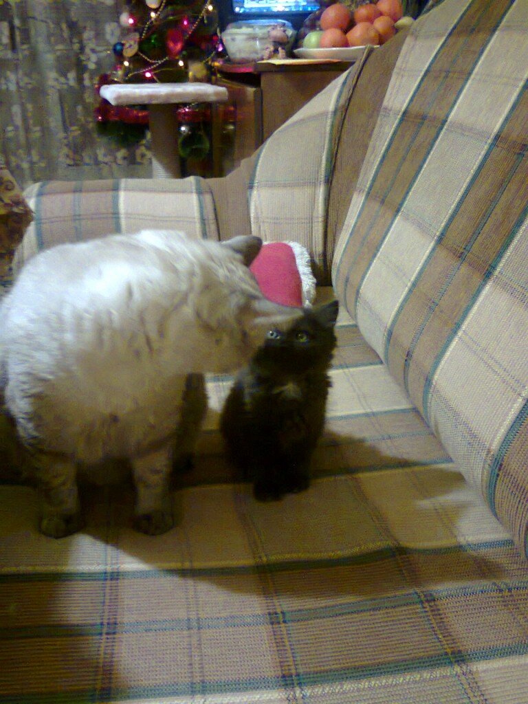 В дружной семье Татьяны случилось большое горе – онкология сразила любимую всеми кошечку. Все члены семьи тосковали по ней, но больше всех – кот Батон. Вечерами он подходил к двери и истошно завывал, звал, ждал свою подружку и снова звал. Но она не приходила. Татьяна стала замечать у Батона слёзы – такие же, как у людей, – горькие и обжигающие душу. Хозяева решили, что коту нужен новый друг, который поможет ему пережить утрату. И хотя любимая кошечка ушла совсем недавно, Татьяна пришла к знакомым, у которых месяц назад родились котята. Она выбрала самого маленького и принесла его домой. Никто не мог сказать заранее, как Батон отреагирует на появление нового питомца в доме, поэтому первое время было решено котов из поля зрения не выпускать, чтобы в случае чего прийти на помощь. Котенок, пока Татьяна несла его домой, не издал ни звука. Но стоило его опустить на пол дома, как он побежал осматривать свои новые владения. Увидев это, Батон был в шоке. Какое-то маленькое черное кошачье сущест