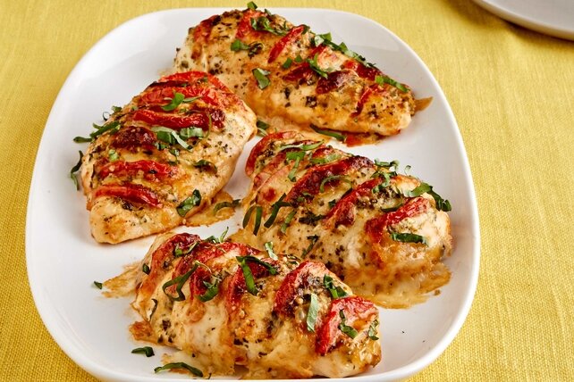 Что же нам понадобиться: - 4 шт куриных грудки (примерно 1 кг) - 4 ломтика сыра Моцарелла - 1 большой помидор - 2 ст.л. чесночного соуса - 2 ст.л. песто соуса - 2 ст.л. тертого твердого сыра (пармезан) - 12 листьев базелика (нарезанных мелко) Начинаем готовить: 1. Для начала нагреваем духовку до 200 градусов цельсия. 2. Берем острый нож и в каждой грудке делаем по 6 глубоких надрезов, но не прорезаем их до конца. 3. Нарезаем кусочки мацареллы так чтобы хорошо помещались в прорезы. 4. Нарезаем тонкими ломтиками помидор, так же что бы помещались в прорезы. 5. После чего помещаем по 2 кусочка сыра и 1 кусочку помидора между ними в прорезы. 6. Смешиваем чесночный соус и соус песто до однородной массы, после чего обмазываем получившейся массой каждый кусочек грудки. 7. Посыпаем сверху тертым твердым сыром (пармезан) и ставим выпекаться на 15-20 минут или до того пока не будет готова. 8. После приготовления, перед подачей посыпаем листьями базилика. Совет. - Если соус песто приготовить сам