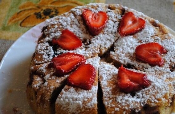 Нет миксера для замешивания пышного бисквитного теста? Не беда! Можно сделать и без него. Получится даже быстрее и вкуснее! А если это тесто дополнить дольками свежей клубнички, то получится вообще чудесный кекс или тортик, смотря как украсите. Ингредиенты: Куриные яйца - 5 штук; Свежая клубника (или другая ягода) - 150-200 грамм; Сахар - 200 грамм; Пшеничная мука - 300 грамм; Вода (или молоко) - 10 столовых ложек; Разрыхлитель теста - 10 грамм; Приготовление Вбить в глубокую миску яйца, насыпать сахар. Перетирать сначала ложкой, затем взбивать вилочкой или венчиком. Каждые 2-3 минуты, добавляйте по ложке воды и снова взбивайте. Муку просеять и соединить с разрыхлителем. Всыпать к взбитым яйцам и снова тщательно вымесить. Форму смазать маслом. Вылить половину теста, выложить нарезанные ягоды, залить оставшимся тестом. Отправьте в разогретую при температуре 180 градусов духовку на 35 минут. Готовый пирог (кекс) можно посыпать сахарной пудрой и украсить несколькими дольками клубники. Об
