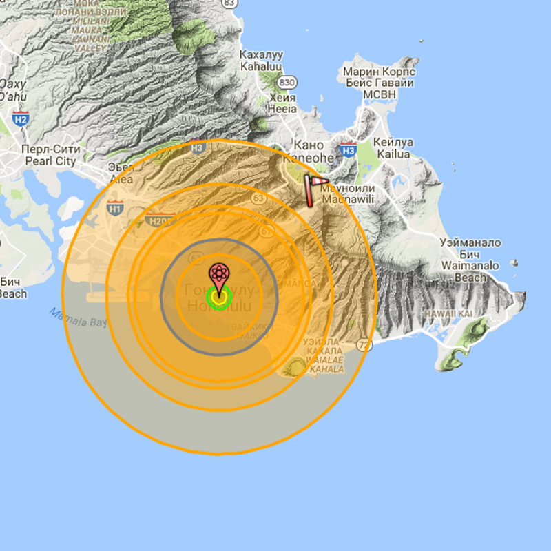 Портал Nukemap опубликовал оценку разрушений и жертв в случае, если бы предупреждение о ракетном ударе по Гавайям не было ошибкой.65Редакция ПМ20 января 2018 13:00 3 66 Утром 13 января жители Гавайских островов получили уведомления о надвигающейся угрозе: «Баллистическая ракета движется в сторону Гавайев, немедленно найдите укрытие», говорилось в СМС. Рассылка вызвала на островах умеренную панику: отменили школьные спортивные матчи, возникли пробки. Через 38 минут местные власти отозвали сообщения и извинились за ложную тревогу. Если баллистическая ракета все-таки была бы выпущена с северокорейского побережья в сторону Гавайев, она, скорее всего, была бы нацелена на столицу штата и самый населенный город — Гонолулу. Если бы энергия взрыва составила 200 килотонн (в тротиловом эквиваленте), число погибших составило бы 150 тысяч человек, рассчитали специалисты Nukemap; число пострадавших составило бы около 173 тысяч. Радиус взрыва составил бы около 500 метров; ионизирующее излучение распр