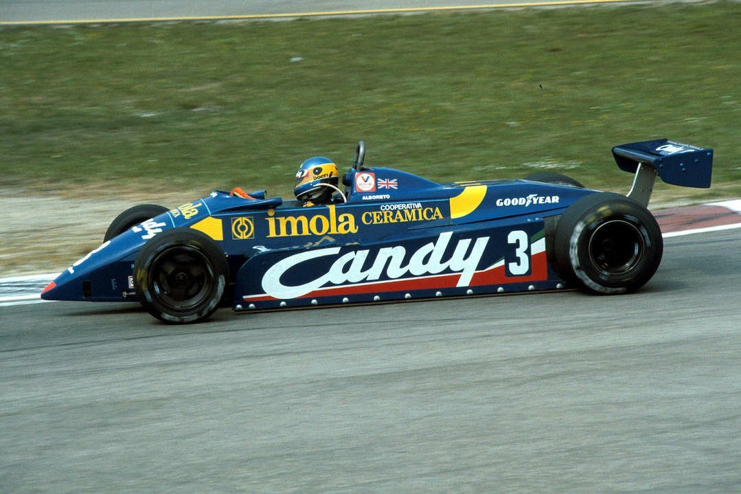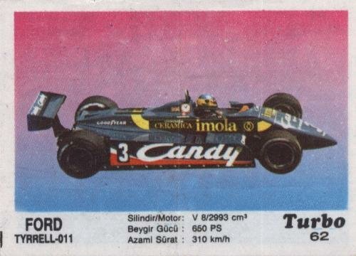 Моя стиральная машина называется «Candy». Другие марки производителей бытовой техники ни о чем мне не говорят. А «Канди» — это родное, родом из детства. Вот и как оценить эффективность рекламы на болидах Ф-1?Производитель оплатил её 35 лет назад, а работает она до сих пор. И будет работать пока людей интересует история гонок, или пока есть коллекционеры вкладышей Турбо. Отлично помню, как заполучив этот вкладыш, я полез в словарь и расстроился, узнав, что это красиво написанное слово переводится как, всего лишь, «Леденец»… О машине. Можно сказать, что модель «011» получилась сравнительно успешной. Использовалась в течении последних гонок 1981, всего 1982 и 2/3 сезона 1983 годов. Основной пилот это болида — Микеле Альборето — смог заработать победу в 1982 году на заключительной гонке в Лас-Вегасе, 25 очков за сезон и 6-е место в кубке конструкторов. В 1983 ему удалось победить в Далласе. Можно констатировать, что довольно простой автомобиль с традиционным алюминиевым монок