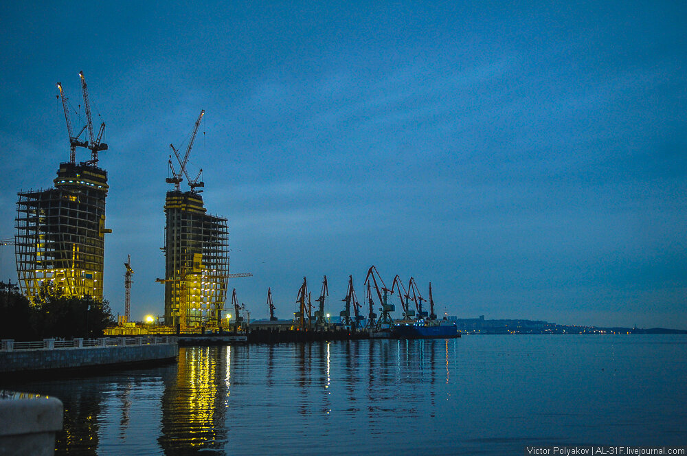 В солнечный Баку мы отправились благодаря мильной распродаже Аэрофлота. После приземления выяснилось, что Азербайджан не такой уж и солнечный в начале ноября, а вовсе и наоборот. На улице лил дождь. Автобус за полчаса довёз нас до центра Баку, мы спустились на набережную и оказались у моря. Потихоньку светало. Дождь то усиливался, то выключался вовсе, а перед нами уже маячила визитная карточка современного Баку – башни-небоскребы. Гуляя по набережной, я обнаружил одно замечательное свойство бакинских луж – прогуливаясь по ним, ботики становятся чище. Почему-то московские лужи или засерают тебя с ног до головы, или растворяют обувь вовсе. Вообще, было очень приятно здесь гулять на рассвете, даже немного повеяло любимой Барселонушкой, когда мимо пролетела толпа зеленых попугайчиков. Или это мне причудилось? Единственное, что немного расстроило – отсутствие переходов через широкую дорогу, отделяющую море от города. Пришлось долго топать, прежде чем был найден подземный переход. Зато пер