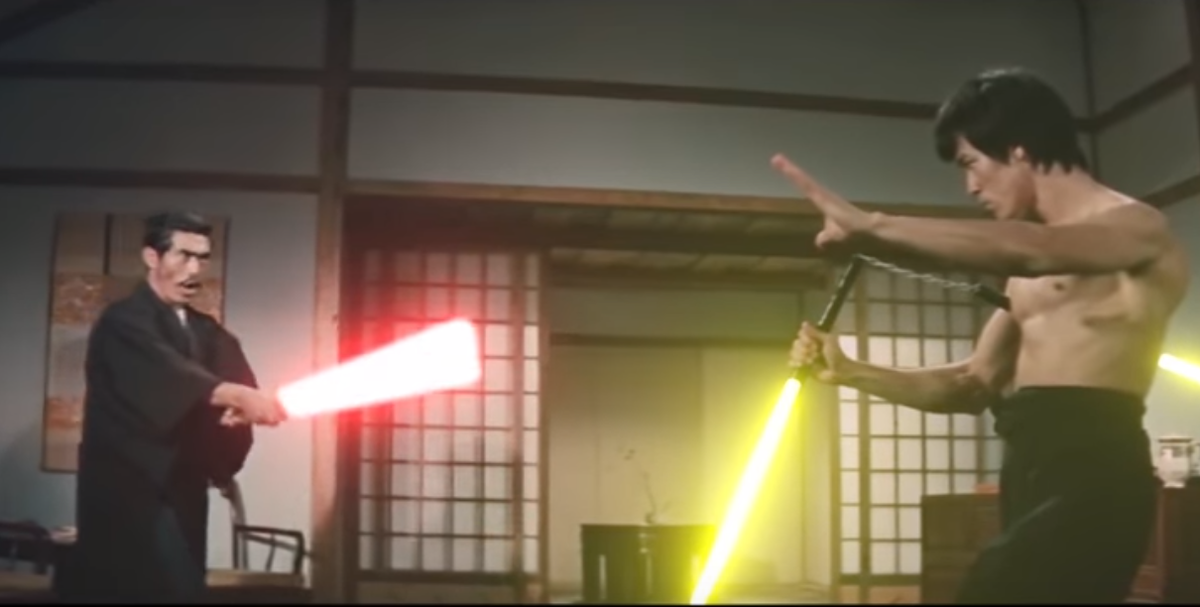 Автор YouTube канала Patrick Nan,воссоздал знаменитую сцену с нунчаками из фильма "Кулак ярости"(1972),только вместо обычных нунчак у Брюса в руках -лазерные мечи.