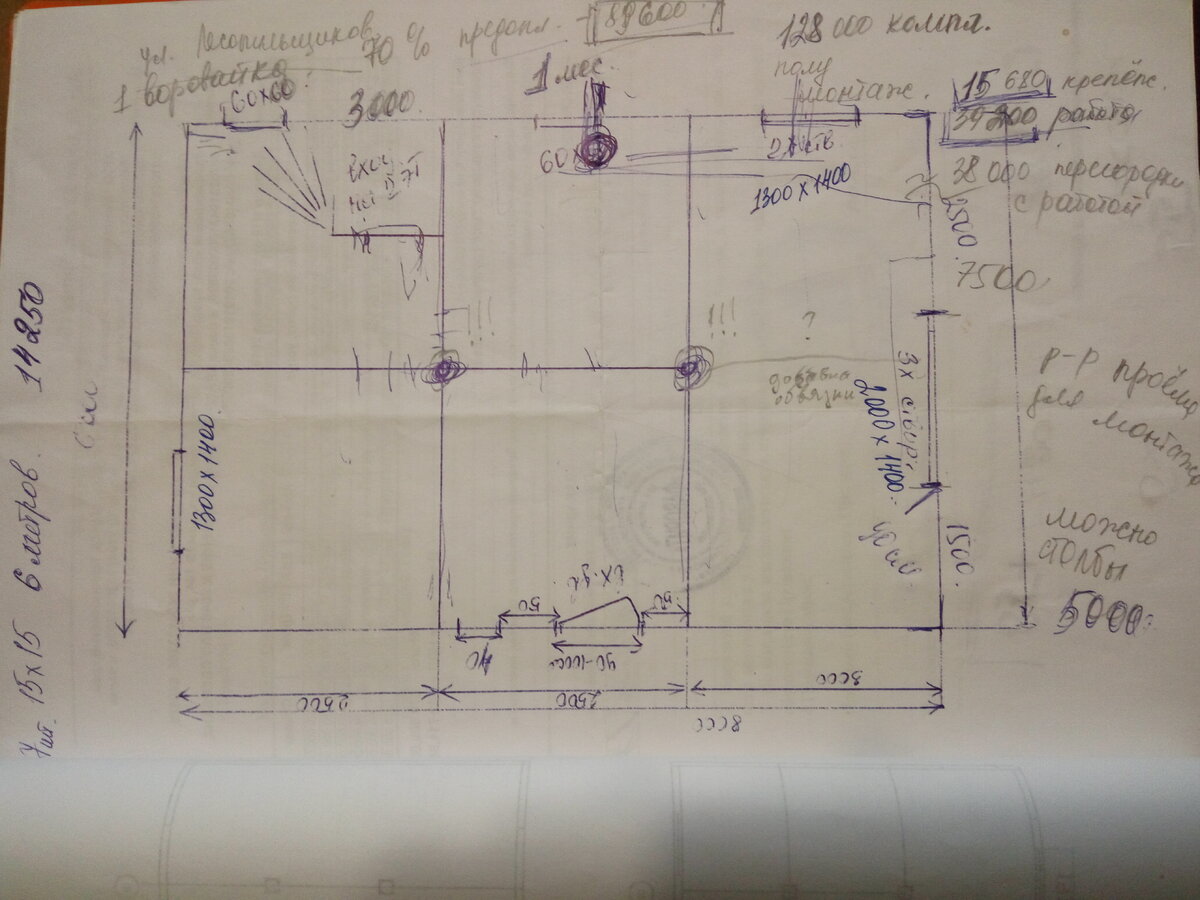 Ещё в офисе строительной компании мы определились сразу же с тем, что я - дама довольно непредсказуемая. Поэтому на предложение сразу спроектировать 1 этаж дома я расхохоталась: да как я могу сказать где у меня будут стены и вход? Если я даже замуж вышла по первоапрельской шутке... Мы вместе посмеялись над реальной жизненной историей и пришли к выводу, что будем вместо перегородок из сип панелей (что удобно, быстро, но очень дорого и сражу же нужны деньги) будем ставить опорный брус. Инженер рассчитал, что для монтажа перекрытий достаточно будет одного вертикального бруса. На черновике появилось два "кружочка", означающих местоположение опорных столбов. Заодно прикинули стоимость услуг возведения перегородки. 38 000 рублей. Я пошла с этой информацией домой к мужу. Ну что для тебя поставить пару столбов? А на сэкономленные на строительно-монтажных работах деньги я обещаю покупать тебе пиво по первой просьбе всё лето... (Путём нехитрых математических подсчётов мне это обходилось дешевл