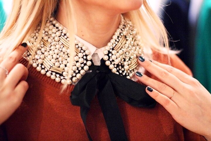 В последнее время рубашки классического стиля приобретают все большую популярность. Для того чтобы рубашку украсить и сделать ее не такой как у всех, достаточно школьных умений шитья и немного фантазии. Все большую популярность приобретают съемные воротники. Тем более, что техника выполнения проста, а поле ваших фантазий масса. Воротники можно расшить камнями, бисером, пайетками, кружевами, бахрамой, пуговицами и т.д. Для того чтобы использовать основу, на которую будете нашивать украшения, вы можете раскроить желаемой вами формы воротник. Но здесь можно и схитрить- распороть его от старой одежды. Здесь на ваше усмотрение. Ниже предлагаем идеи расшива воротников: