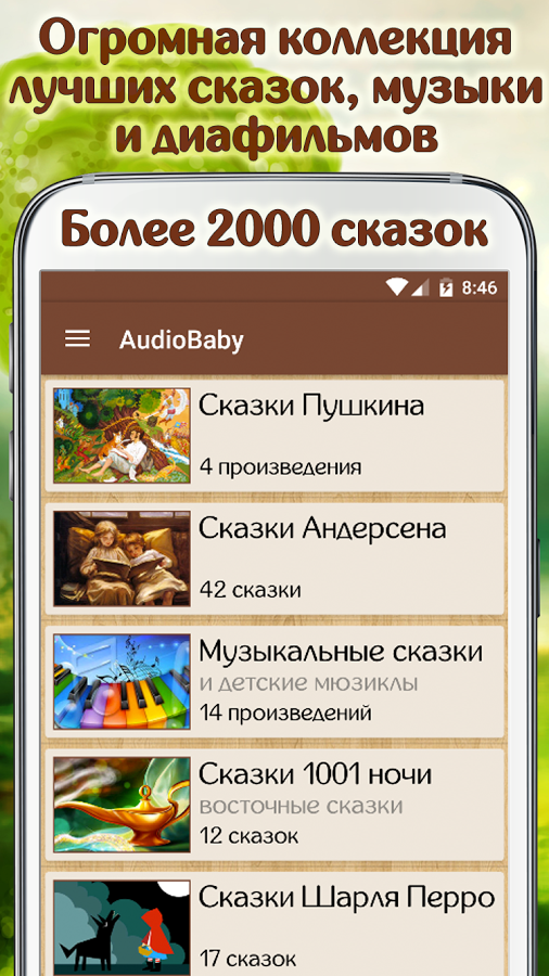 Современные дети начинают пользоваться смартфонами задолго до того, как у них появится собственный гаджет. Едва научившись ходить и произносить несколько слов, дети с интересом тестируют телефоны родителей. Рассказываем, какие приложения станут палочкой-выручалочкой для взрослых дома, в поездках, пробках, очередях и будут при этом интересны ребёнку. Сказки — Все детские произведения Несмотря на название, в приложении собраны не только сказки, но и музыка, колыбельные, диафильмы, загадки и потешки. Всего более 3 000 композиций. Их можно послушать или скачать. Если теряетесь и не знаете, что выбрать, в любой момент можно ознакомиться с советами детских психологов или рейтингом, составленным по отзывам и оценкам пользователей. Кроме того, все сказки можно сохранять и слушать без подключения к интернету. Ещё одна удобная опция — закладки, позволяющие вернуться к недослушанному произведению. Под каждой из композиций можно найти оценку (от 1 до 5 звёзд) и длительность — эти функции помогу