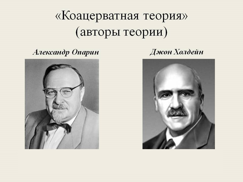 Теория Опарина-Холдейна В 1924 году российский ученый-биохимик Александр Иванович Опарин опубликовал свой труд под названием «Происхождение жизни». В ней он сформулировал свою гипотезу о зарождении жизни на Земле. В ее основе лежит идея возникновения жизни в результате продолжительной эволюции органических соединений. А.И. Опарин предположил, что 4-4,5 млрд лет назад произошло абиогенное (неорганическое) образование таких органических веществ, как аминокислоты и белковоподобные полимеры (полипептиды). Произошёл этот процесс в результате целого ряда химических превращений, катализатором которых были особые условия, царившие в то время на планете. Это и мощное ультрафиолетовое излучение, и сильные электрические разряды в атмосфере, и выделение огромного количества тепла при извержении вулканов. Таким образом, из аммиака, метана, водорода, углекислого газа и паров воды образовалось первое органическое вещество. Основной мыслью теории Опарина является возникновение предшественников жиз