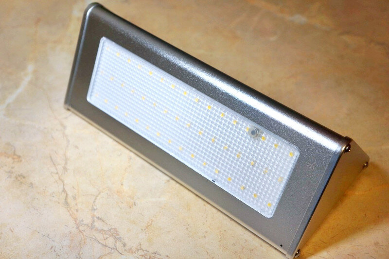 Представляю обзор еще одного фонаря на солнечных батареях из моего «арсенала» (развесил подобные по дачному дому и участку). с датчиком освещенности и движения. На этот раз 48 светодиодов и алюминиевый корпус.